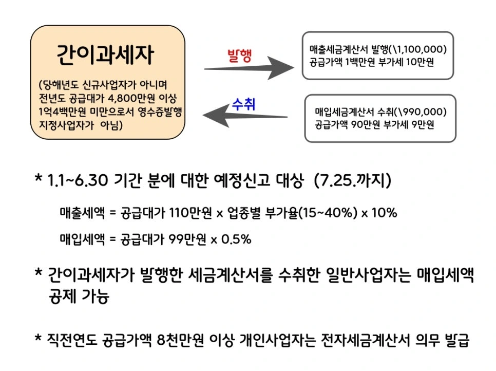 따라서 연간 공급대가 4,800만원 이상 1억 4백만원 이하의 간이사업자 중 주로 최종소비자를 상대하지 아니하는 간이사업자의 경우 세금계산서 발행 교부의무가 있으며 역월 1.1~6.30일까지의 기간 중 세금계산서를 발행한 사실이 있는 간이과세자는 동 기간에 대하여 7.25.까지 부가가치세 예정신고 및 납부 의무가 있습니다.