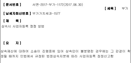 위 질의 회신문에 따르면 상속재산에 대하여 소송이 진행중에 있어 상속인이 불분명한 경우에는 그 판결이 확정될 때까지 민법에서 규정된 법정상속지분에 따라 사업자등록 정정신고한다고 되어 있다. 다만, 소송이 진행 중인 경우에 한정지을 것은 아니고.. 꼭 소송전이라도 상속인들간 다툼이 있어 협의분할이 불가한 경우 그 소유권이 확정될 때까지는 민법상 지분으로 정정신고를 하고 그 후에 판결이나 협의분할 등에 의해 확정되었을 때 재차 정정신고를 해야 하는 것으로 해석함이 맞다고판단되어 진다.